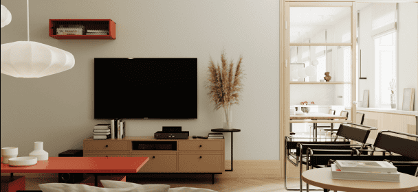 Warstwowość brył, naturalne drewno, minimalistyczne formy.